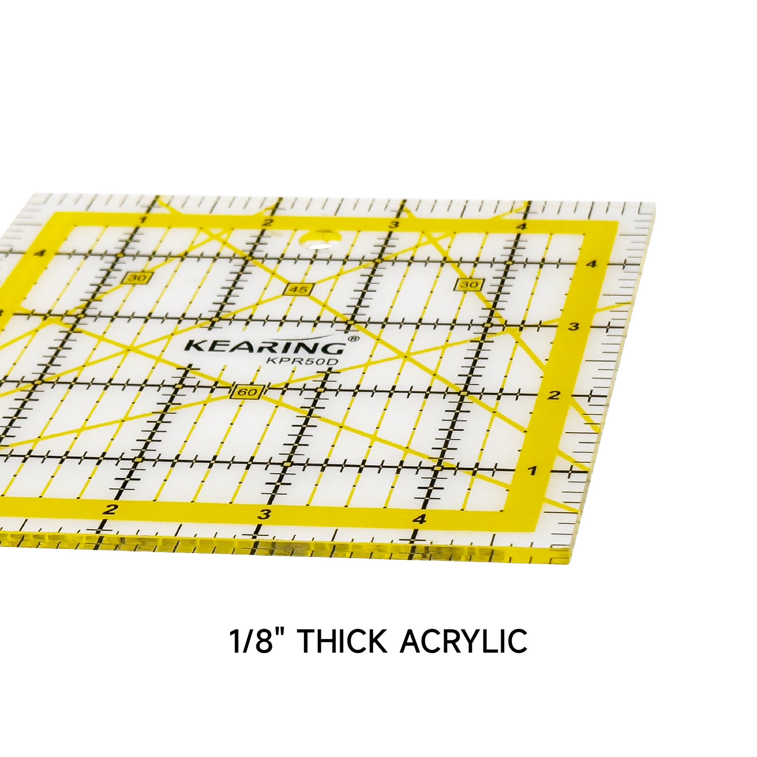 This Kearing 5 × 5 inch square quilting ruler is a must have tool for all sewers, quilters, and crafters. It is transparent and easy to use for both left and right handed quilters. Clear yellow and black color measuring lines enable you to easily see your quilt fabrics through this ruler. Durable acrylic plastic ruler is ideal for sewing, quilting, crafting projects, you should be able to use it for measuring with confidence during needlework, fabric, and sewing design, etc.