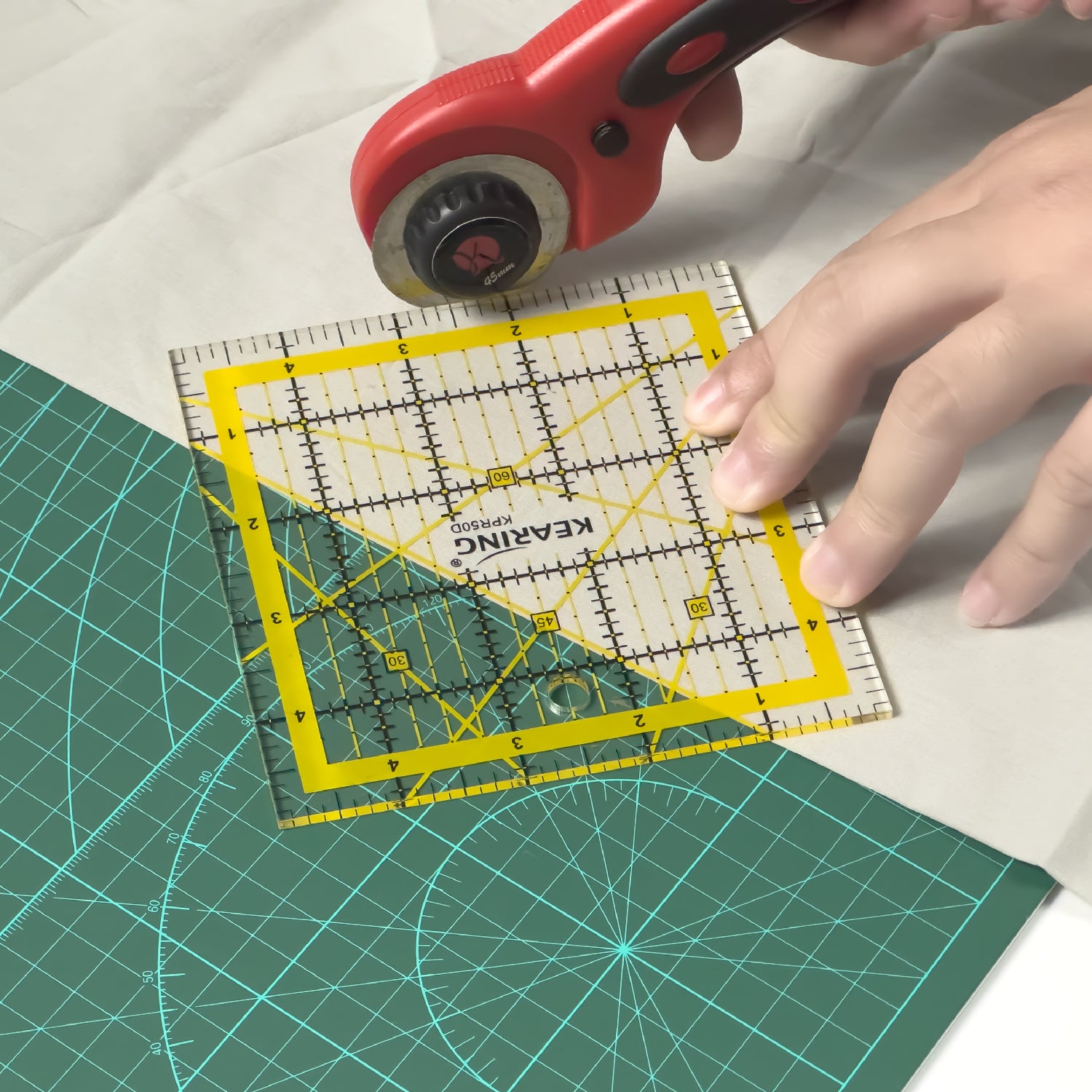 3mm thick rigid plastic ruler for use with a rotary cutter to cut squares and for squaring up.
